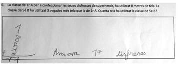 Se utilizan todos los números del enunciado, aunque sean datos o caracteres numéricos. La Figura 9 muestra un ejemplo de uso de esta estrategia en un problema de comparación multiplicativa de multiplicación, en la que se utilizan tanto los datos del problema (8 metros de tela y 3 veces más tela) como los que indican el curso (1º y 5º)