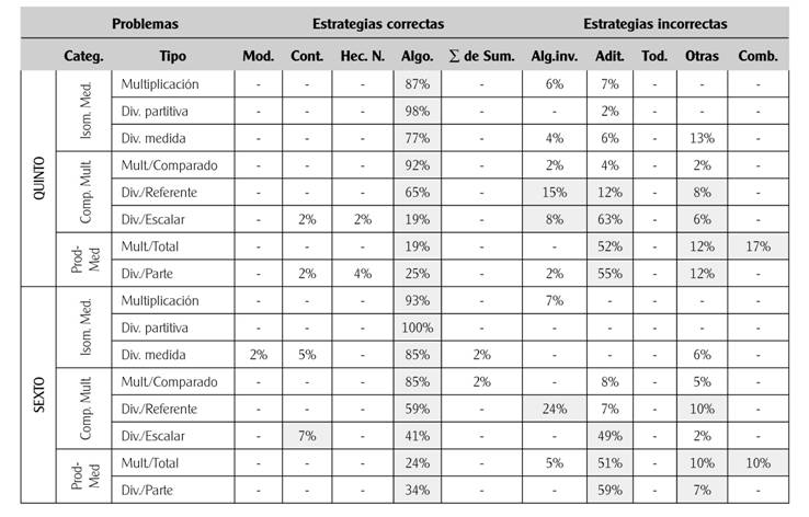 Las estrategias incorrectas se agruparon en 5 categorías: i) Uso del algoritmo inverso, ii) Uso de relaciones aditivas no adecuadas (aditiva), iii) Uso de todos los números del enunciado, iv) Combinación uno a uno, y v) Otras, en las que agrupamos las estrategias sin sentido y las respuestas en blanco.