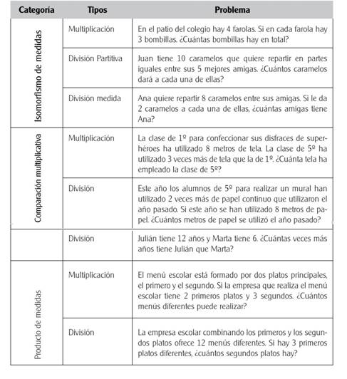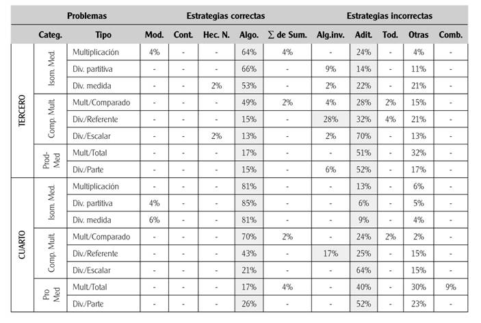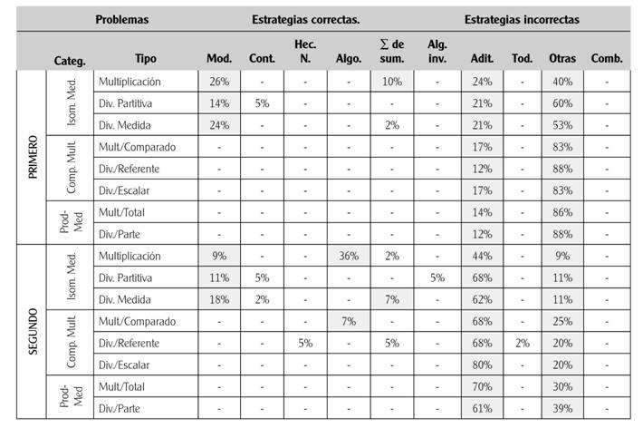 Por otra parte, en la revisión efectuada por Verschaffel y De Corte (1997) se destaca que las estrategias incorrectas más comunes utilizadas en los problemas de estructura multiplicativa son: la estrategia aditiva, uso de todos los números del enunciado y fijarse en las palabras clave del enunciado. Otras investigaciones aportan información sobre las estrategias usadas por los estudiantes en tipos particulares de problemas: Neuman (1999) en los problemas de división medida y división partitiva (tipos de problemas de isomorfismo de medidas) en alumnos de 2º a 6º curso (7 a 12 años) y Castro (1995) en los problemas de comparación multiplicativa con estudiantes de 5º y 6º curso. En cuanto a los problemas de producto de medidas, Nesher (1992) indica que uno de los errores más comunes entre los alumnos de 3º a 6º curso es realizar una suma, cuando lo que se requiere es hacer una multiplicación.