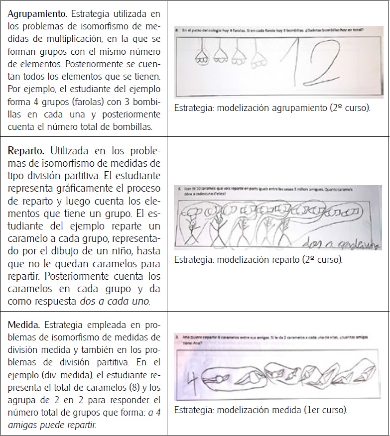 Esta estrategia se ha empleado en los problemas de isomorfismo de medidas de división partitiva y de división medida, adoptando diferente forma según el tipo de problema (Tabla 5).