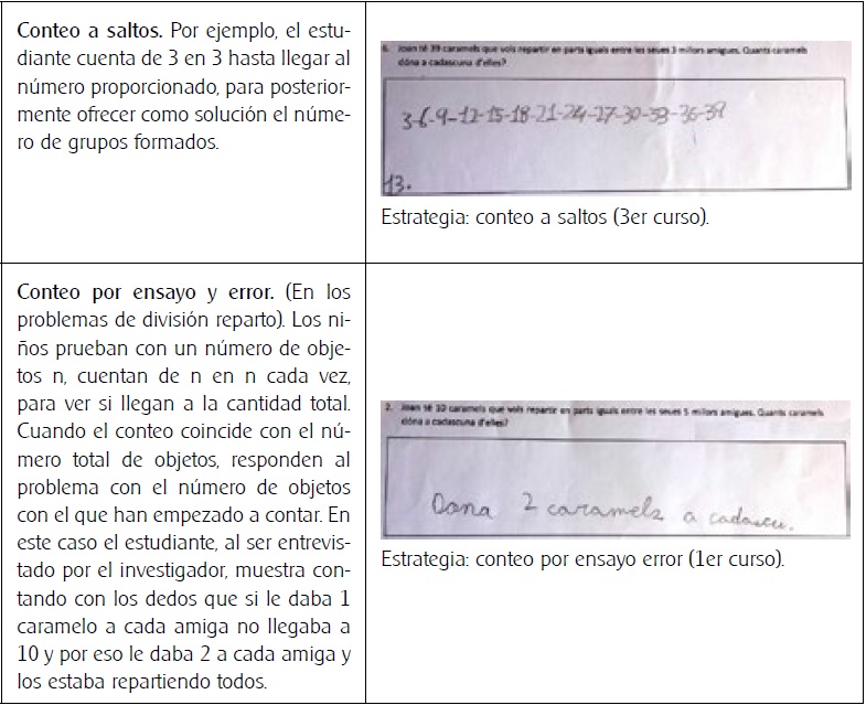 Carpenter, Fennema, Franke, Levi y Epson (1999) afirmaron que los estudiantes van sustituyendo gradualmente las estrategias de modelización por las de conteo, lo cual indica que aplicar el conteo en los problemas de estructura multiplicativa es más difícil que en los de estructura aditiva. Neuman (1999) subrayó que el conteo es una de las estrategias más frecuentemente utilizadas por el alumnado de 2º curso, y esto muestra una progresión, desde el uso de las estrategias de conteo hasta el uso de hechos numéricos conocidos, que es más eficiente (Verschaffel, Greer y Torbeyns, 2006).