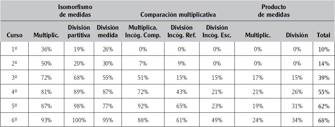 Considerando estos resultados globalmente, hubo un aumento progresivo del nivel de éxito en la resolución de los problemas de estructura multiplicativa, desde 10% en 1er curso hasta 68% en 6º curso, sin embargo esta evolución no fue uniforme en las diferentes categorías de problemas ni en los diferentes tipos de problemas dentro de cada categoría. Por otra parte, los porcentajes de éxito en 5º y 6º curso (62% y 68%, respectivamente) se consideran relativamente bajos y muestran las dificultades en la resolución de problemas de estructura multiplicativa en Educación Primaria.