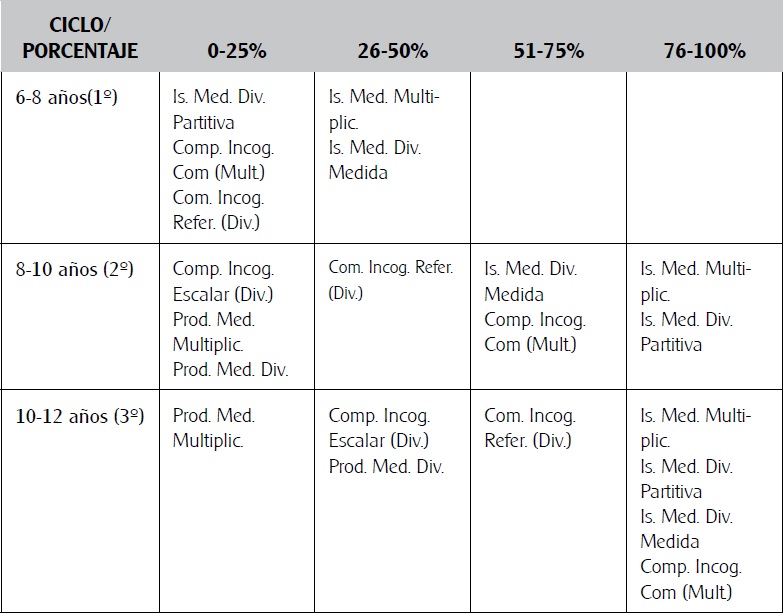Si analizamos la evolución en el nivel de éxito a lo largo de Educación Primaria de las diferentes categorías de problemas, es posible identificar características relevantes. En la categoría isomorfismo de medidas en los tres primeros cursos, los problemas de multiplicación son los más fáciles (frente a los dos tipos de división), siendo los problemas de división medida más fáciles en 1er y 2º curso, y los de división partitiva más fáciles en 3er curso (invirtiéndose en este curso el nivel de dificultad para los dos problemas de dividir). Sin embargo, en los tres últimos cursos los problemas de división partitiva fueron los más fáciles, seguidos de los de división medida y por último los de multiplicación (a excepción del 5º curso, donde disminuyó el porcentaje de éxito en los de división medida). En relación a los problemas de comparación multiplicativa, se mantiene el mismo patrón a partir del 3er curso (en 2º, el porcentaje de éxito fue muy bajo). Los problemas de multiplicación fueron los más fáciles en todos los cursos, mientras que entre los problemas de dividir, los problemas con incógnita el escalar eran más difíciles que los problemas con la incógnita el referente. Por último, en los problemas de producto de medidas, los problemas de multiplicación fueron más fáciles en 3º, pero a partir del 4º curso los problemas más fáciles en esta categoría fueron los de división.