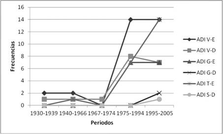 Durante los tres primeros periodos educativos el fenómeno a.s.i aparece con muy poca frecuencia mientras que el fenómeno ADI tiene una frecuencia bastante mayor que el fenómeno a.s.i; sus respectivas frecuencias agregadas son 2 y 7, respectivamente. En valores relativos, este hecho no es tan marcado en el caso de la comparación en estos tres primeros periodos entre el fenómeno i.v.s y el fenómeno IVF siendo la frecuencia agregada del primero 23 y la del segundo 28.