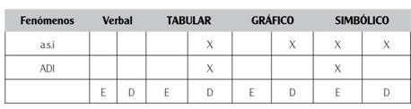De los ocho casos posibles que podemos formar considerando el fenómeno ADI, los sistemas de representación (verbal, gráfico, simbólico y tabular) y los formatos (ejemplos y definición), aparecen seis casos en los libros de textos.