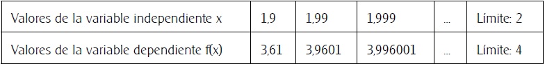 Modelo ADI 1, dos sucesiones coordinadas. En la función f(x) = x2, si tomamos los pares de valores (1,9; 3,61), (1,99; 3,9601), (1,999; 3,99601). . . , se observa que cuando x se acerca a 2 los valores f (x) se acercan a 4.