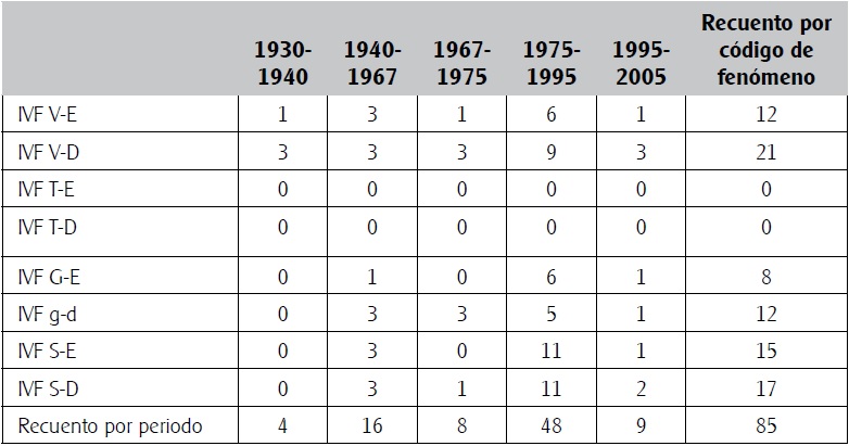 En los periodos 1933-1939, 1940-1966 y 1967-1974 apenas se da el fenómeno ADI, mientras que el fenómeno IVF se presenta en bastantes más ocasiones, siendo las relaciones entre ambos: 3:4, 3:16 y 1:8, respectivamente.