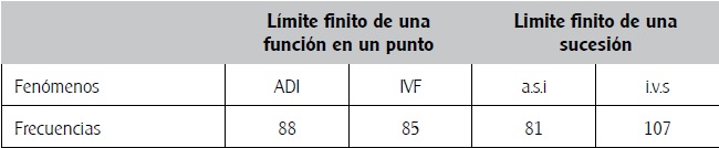 Si observamos esta tabla, concluimos que el límite finito de una sucesión tiene un carácter más formal que viene determinado por el mayor uso del fenómeno i.v.s en detrimento del fenómeno a.s.i. Sin embargo en el caso del límite finito de una función en un punto el peso asociado a cada fenómeno intuitivo (ADI) y formal (IVF) es prácticamente el mismo.