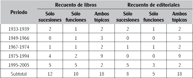 De los 40 libros, 30 de ellos estudian sucesiones, 28 funciones y en 18 de ellos se estudian ambos tópicos. Una distribución del número de libros, sus respectivas editoriales y tópicos en cada periodo considerado se presenta en la Tabla 2.