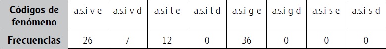 Criterio 4º, resúmenes y comentarios. Para resumir toda la información extraída usamos tablas de tres niveles lógicos que dejan el espacio necesario para todos los códigos de fenómeno y, en cada celda, incluimos el código asignado a cada fragmento de una unidad de información en la que se reconoció el fenómeno.