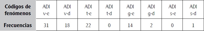 De esta manera puede aparecer un código de fenómeno como ADI v-e que hace referencia al fenómeno de aproximación doble intuitiva en el sistema de representación verbal y en el formato ejemplo.