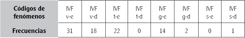 La Figura 4 resume la evolución a lo largo de los diferentes periodos educativos de los códigos de fenómeno IVF. Para hacer más cómoda la observación de esta figura hemos omitido las filas con todas sus entradas nulas en la Tabla 10.