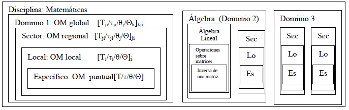 Las praxeologías matemáticas u organizaciones matemáticas (OM), pueden ser estudiadas en el marco de una institución I, considerando la jerarquía de niveles de determinación propuesta por Chevallard (2002). En esta jerarquía se propone un modelo de normas y restricciones que la institución I impone a las (OM). Este modelo reposa sobre una estructuración que organiza las praxeologías en diferentes niveles anidados, que de acuerdo a un orden de complejidad creciente son los siguientes: específico (OM puntual), local (OM local), sector (OM regional) y dominio (OM global).
