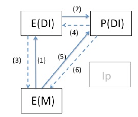 En la figura 2 las flechas indican que la relación se da en dos sentidos: la incidencia de una institución sobre otra responde al interés de estudiar cómo una praxeología P presente en una institución I puede ser reconocida como una trasposición de P en I’. En un modelo de formación tradicional las relaciones 1, 2 y 5 se suponen existentes. Consideramos que las relaciones 4, 3 y 6 pueden existir, y en particular nos interesamos en posibilitar la relación 6, para que la enseñanza de la matemática dote de herramientas “realmente” necesarias al futuro ingeniero. Así, el análisis tiene como base la praxeología BSS enmarcada en P(DI).