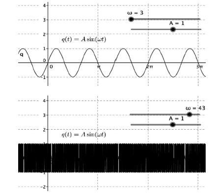 En la figura 3 se muestra la función y = Asin(wt), con frecuencias w = 3 Hz y w = 43 Hz. El oído humano percibe frecuencias entre 200 y 2000 Hz.