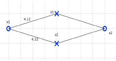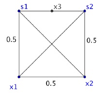 La configuración (A) muestra un arreglo de 3 fuentes y 3 observaciones, mientras que la B tiene 3 fuentes y 8 observaciones. La cuestión, ¿en cuál de las configuraciones sería más fácil separar las señales?, hace emerger dos elementos: la distancia entre las fuentes y las observaciones, así como el número de cada una. En la configuración (B) son muchas más observaciones que fuentes, lo que lleva a una situación sobredeterminada. En una configuración con menos fuentes que observaciones, la información observada es subdeterminada (insuficiente), la configuración A tiene asociada una matriz de mezcla cuadrada. A partir de una discusión sobre estas diferencias, es posible inducir una técnica que permita modelar la relación entre fuentes y observaciones como una combinación lineal. Para ejemplificarlo veamos la figura 5, esta configuración representa a dos embajadores, situados en los puntos s1 y s2. Su conversación se registra con tres grabadoras, situadas en x1, x2 y x3 de acuerdo a la distancia indicada (por ejemplo, hay 0.25 metros de distancia entre la grabadora x3 y la persona s1). Entonces, el modelo es el siguiente: cada observación xi es una mezcla lineal de las 2 fuentes s1 y s2. Los coeficientes de la combinación lineal están dados por 1/(dij)2 donde dij es la distancia entre la observación xi y la fuente sj.