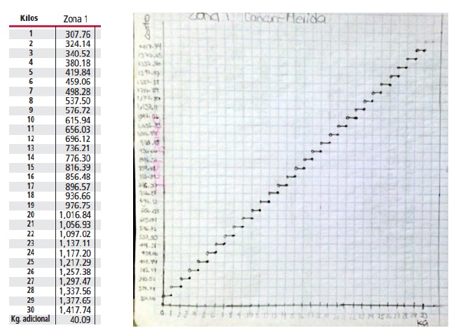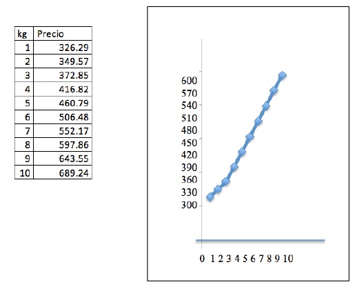 La Tabla de datos (figura 8) presenta parte de las operaciones llevadas a cabo por el equipo E antes de graficar. Esta tabla de datos no contiene el error de los estudiantes, quienes en lugar de obtener 118.1 como diferencia, obtuvieron 118.2. También se muestra la gráfica, que fue dibujada para la presentación grupal (figura 9). La parte superior de la gráfica es la punta de una flecha que indica que la diferencia será la misma para cualquier otro paquete, cuyo peso sea mayor a los 30 kg.