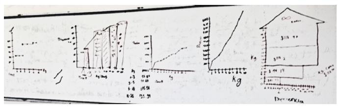 Los estudiantes dibujaron en el pizarrón sus gráficas (figura 9). En seguida, hubo discusión grupal alrededor de los procedimientos y las diferentes representaciones utilizadas para responder la pregunta ¿Cómo podríamos describir el proceso de cobro de la compañía para una determinada zona tarifaria? Para propiciar interés, participación y discusión de todo el grupo, el profesor sugirió a cada equipo la exposición de los distintos procedimientos, pero en lugar de explicar al grupo la propia representación, solicitó a los equipos que pasaran a presentar la de otro equipo. El objetivo era la revisión de representaciones a partir de la interpretación de otro equipo, la diferenciación y al mismo tiempo búsqueda de elementos comunes entre ellas. Es decir, se pretendía que los alumnos comprendieran mejor la situación con base en las distintas representaciones, pero al mismo tiempo se deseaba que los estudiantes analizaran los registros y observaran cómo las cantidades o variables (precio y peso del paquete) cambiaban de manera conjunta.