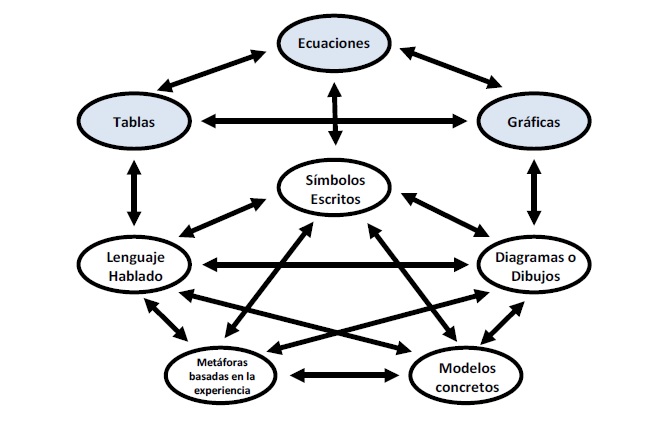 Al resolver un problema, los estudiantes deben entender que cada registro de representación (tablas, gráficas, metáforas basadas en la experiencia, diagramas o dibujos, modelos concretos, lenguaje hablado, símbolos escritos, ecuaciones) proporciona información diferenciada, la cual permite visualizar una situación desde diversas perspectivas e incrementar el nivel de comprensión sobre ésta y conceptos subyacentes. Dada una tabla, los alumnos deberían ser capaces de graficar la información y representarla mediante alguna relación funcional en el registro algebraico, con la finalidad de describir, interpretar y predecir el comportamiento del fenómeno que se está analizando. El trabajo en equipo es fundamental, dado que la comunicación permite a los estudiantes externar sus formas de pensamiento o modelos, compartirlos, probarlos y refinarlos (Lesh y Doerr, 2003).