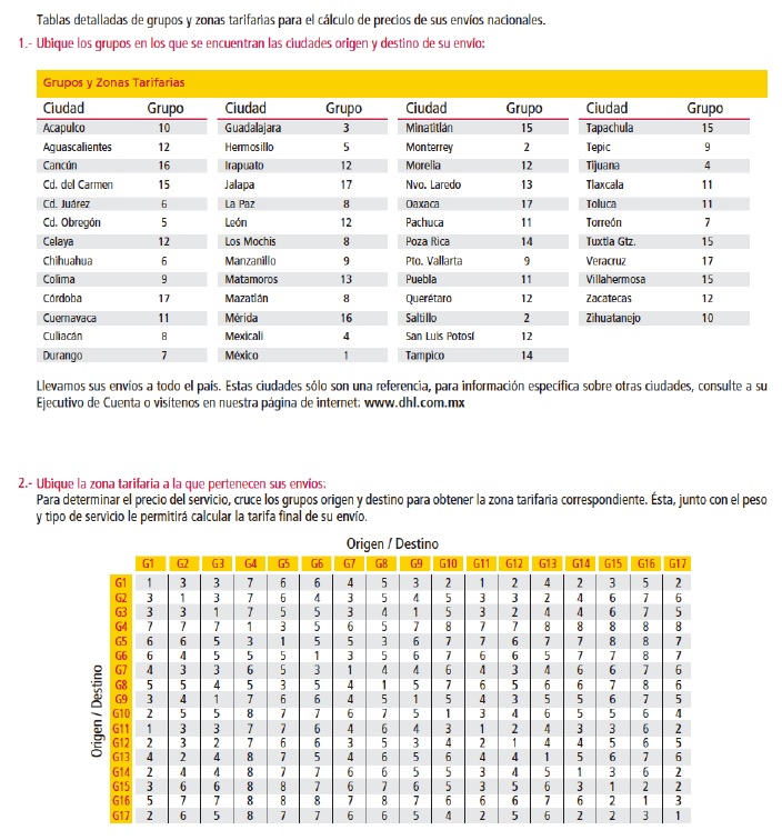 La situación descrita en este artículo se denominó DHL porque incorpora información parcial sobre la manera real como la empresa DHL cobra por su servicio de envíos nacionales (figuras 2 y 3). Incluye preguntas auxiliares cuyo objetivo es que los estudiantes centren la atención en los datos requeridos para reflexionar sobre la pregunta principal relacionada con los costos de envío como función del peso del paquete.