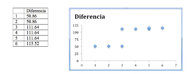 Los equipos A y B presentaron gráficas que, de acuerdo con su explicación, representaban la diferencia en costo vs el peso del paquete; tomaron datos de la zona 8. El equipo A, por ejemplo, elaboró una tabla de datos y una gráfica como se muestra en la figura 4. Los estudiantes fueron registrando una a una las diferencias conforme las iban calculando en un arreglo de columna que posteriormente utilizaron como tabla de datos para graficar. La primera columna de datos de su tabla (figura 4) parece corresponder a la primera diferencia, segunda diferencia, tercera diferencia, etc. En la segunda columna de la tabla incluyeron las diferencias calculadas con cada uno de los datos, correspondientes al precio o tarifa por kilogramo, de la columna de la tabla (figura 3) correspondiente a la zona 8. Hicieron una gráfica poligonal. En el eje x (eje horizontal) ubicaron los números del 1 al 6 y en el eje y (eje vertical) los valores: 25, 50, 75, 100, 125. Estos valores fueron utilizados como referencia para ubicar en la gráfica los que ellos calcularon.