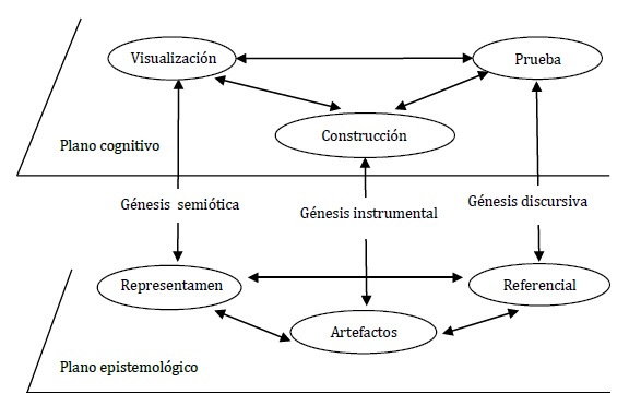 El plano epistemológico está constituido por tres componentes o polos: referencial teórico que está constituido por las propiedades, los teoremas, las definiciones; el representamen (o representante) constituido por signos semióticos; y el artefacto, que corresponde al uso de elementos materiales o simbólicos. El plano cognitivo está también conformado por tres componentes: los procesos de visualización, construcción y prueba. La articulación entre estos planos se realiza mediante un conjunto de génesis: semiótica, instrumental y discursiva que favorecen su coordinación (Kuzniak, 2011), como se muestra en la figura 1.