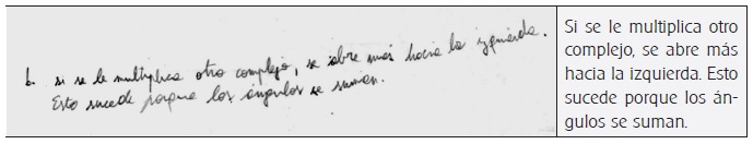 Esta pregunta es crucial para poder determinar si el alumno logró visualizar e interpretar lo que ocurría con la multiplicación de dos números complejos. Aquí podemos ver una drástica diferencia respecto de la primera implementación con la segunda; en la primera, ningún alumno pudo responder a la pregunta (por diversos factores, como tiempo, tipo de artefacto, ausencia de circulaciones entre planos), no obstante en la segunda, ambos binomios responden correctamente a la pregunta.