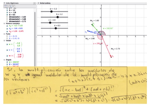 B1: “La relación es que la multiplicación de los módulos de los números complejos va a ser igual al módulo del vector resultante”.