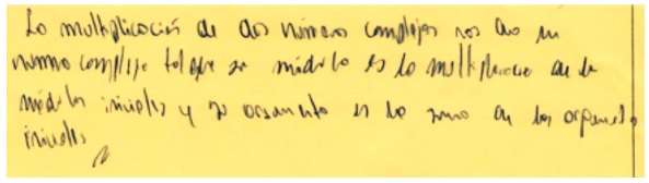 E. De los 34 estudiantes 1 de ellos responde a las preguntas justificando a partir de los valores tomados para (a + bi ) × (c + di ), como se mostró en la figura 11.