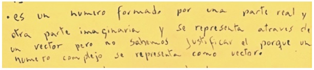 B2: “Es un número formado por una parte real y otra parte imaginaria y se representa a través de un vector pero no sabemos justificar el porque un número complejo se representa como vector”.
