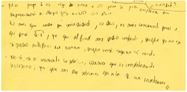Luego de la reformulación del instrumento en la primera fase, se pudo constatar la importancia de crear situaciones que ayuden a la construcción del conocimiento poniendo atención en detalles tan importantes como la definición de unidad imaginaria, esto no se podría realizar sin la participación del profesor, quién es el que debe crear o facilitar el escenario para que los estudiantes construyan el objeto matemático y los saberes involucrados. Considerando lo anterior, sugerimos trabajar con la definición i 2 = -1 y no con , pues a pesar que no existe error en la notación, los estudiantes suelen incurrir en el error de aplicar propiedades que sólo se cumplen en ℝ, y no en las raíces con cantidad subradical negativa.