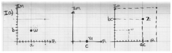 Dado el complejo w = a + bi. Analice qué sucede con la gráfica de dicho complejo al multiplicarlo por el complejo v = c + di, con c, d Î ℝ. ¿Se podrá describir gráficamente lo que sucede al multiplicar un complejo cualquiera por otro complejo cualquiera, sin la necesidad de realizar un procedimiento algebraico? Justifique su respuesta.