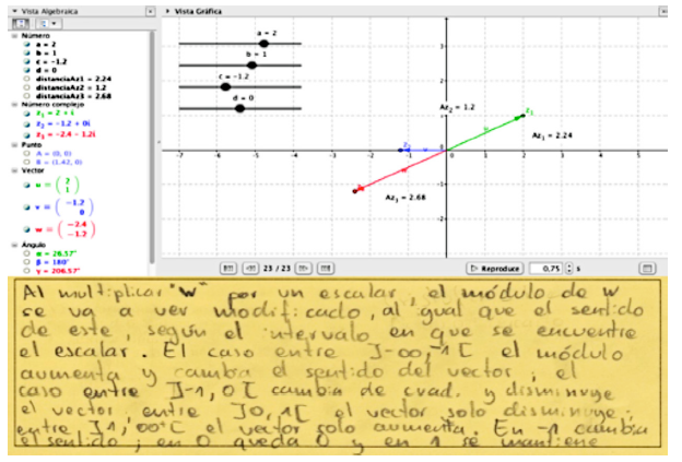 B1: “w × v1 = (a + bi) · (c + 0i) = ac + bic. Al tener el vector v1 = c + 0i = c, entonces el número complejo w, viéndolo como un vector en lo único que cambiaría al ser multiplicado por el escalar v, sería en el módulo. Si 0 < c < 1 el módulo del vector disminuiría pero mantendría el sentido, si c > 1 el módulo aumentaría y se mantendría el sentido, si c < 0 el sentido cambia pero independientemente del valor de v1 se mantiene la dirección”.