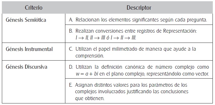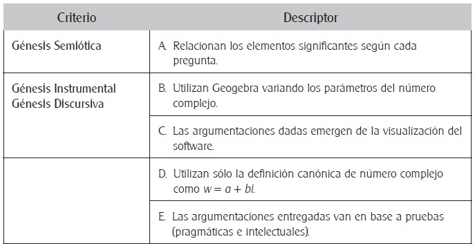 Se establecieron cinco descriptores para cada uno de los tres criterios establecidos que se refieren a las génesis involucradas en el ETM, luego de esto, se analizó cada descriptor en relación con los planos activados de acuerdo a cada una de las preguntas del cuestionario. A continuación se presenta el análisis realizado para cada uno de los ítems.