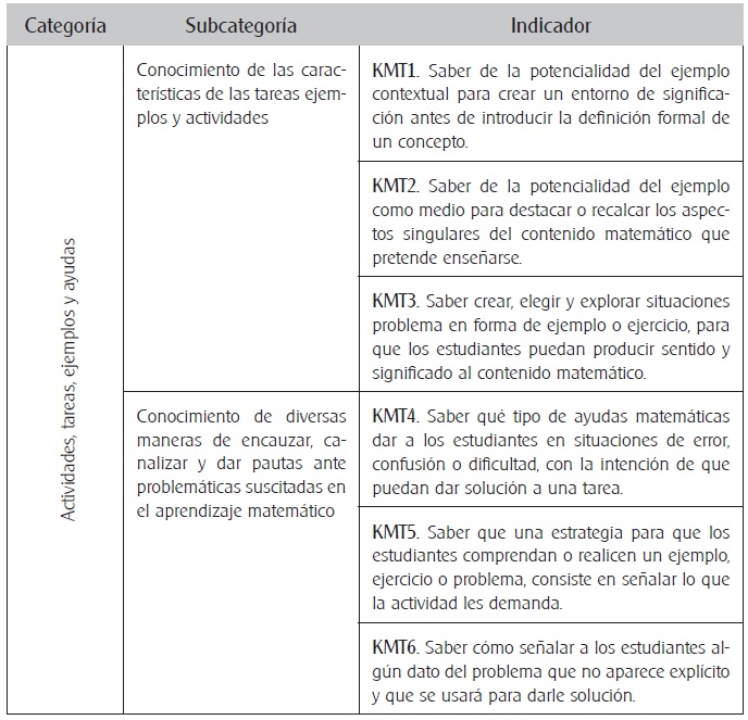 Cada uno de los descriptores que abstrajimos, y que presentaremos en la tabla 1, pertenecen a la misma categoría dentro del KMT que se llama actividades, tareas, ejemplos, ayudas (Carrillo et al., 2014a). Se trata de elementos de los que el profesor se vale para gestionar los contenidos entre los estudiantes de su clase. En este caso, el tipo de gestión que tienen las profesoras se relaciona con una comunicación mayoritariamente unidireccional en la que la profesora asume la responsabilidad del aprendizaje y se convierte en el medio de validación del conocimiento. Queremos subrayar que nuestra intención es comprender el conocimiento que ponen en juego las profesoras. No nos posicionamos desde una perspectiva evaluativa, sino desde una interpretativa, por lo cual, no hacemos juicios de valor acerca del tipo de determinaciones y acciones que llevan a cabo. Para fines prácticos, hemos dividido la categoría en subcategorías referentes a ejemplos y a ayudas.
