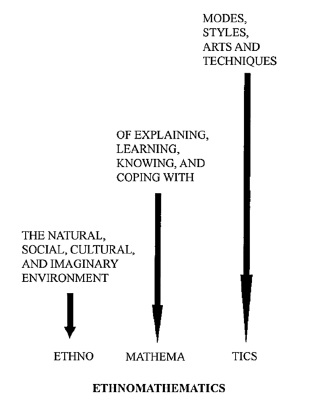 Llamamos Etnomatemáticas al arte o técnica6 de entendimiento, explicación, aprendizaje sobre, contención y manejo del medio ambiente natural, social, y político, dependiendo de procesos como contar, medir, clasificar, ordenar, inferir, que resultan de grupos culturales bien identificados.