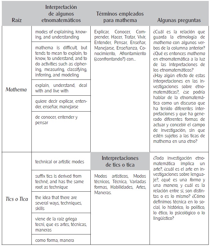Estas raíces etimológicas se han citado en repetidas ocasiones, en diversas investigaciones y durante varias décadas, en particular lo que se ha denominado la definición etimológica de Etnomatemática de Ubiratan D’Ambrosio. A este respecto, podemos ver que en la columna Términos empleados para mathema de la tabla 1, hay más de 12 verbos para dicha raíz. Al construir algunas relaciones entre estos verbos se puede llegar a conceptualizaciones independientes y diferentes como: explicar –conocer, comprender– hacer, conocimiento-enseñanza. Es decir, que al comparar los significados o conceptos implicados en los verbos, se puede llegar a posiciones opuestas o diferentes. En cuanto al conjunto de interpretaciones sobre tica, vistas en la columna Interpretaciones de tics o tica, consideramos que las diversas interpretaciones conllevan a un reduccionismo metodológico al momento de investigar, indagar por la etnomatemática en una comunidad, por ejemplo, no es simplemente llegar con una rejilla analítica, que responda la pregunta ¿cuáles son sus ticas de mathema? Por otro lado, el abuso etimológico con esta raíz tica o tics, encarna una contradicción y es que ella no guarda relación alguna con técnica o con la techné, y técnica es un reduccionismo de techné. Las mismas preguntas, que están establecidas en la tabla 1