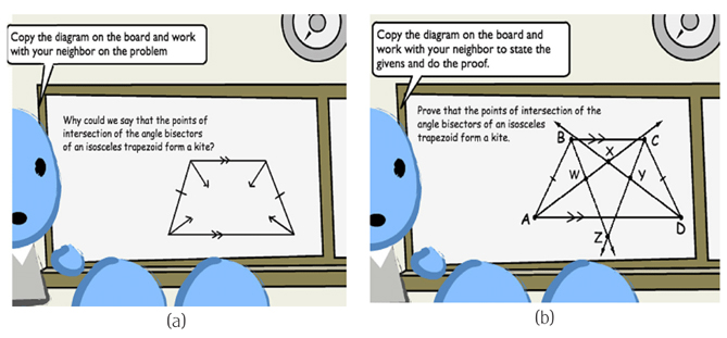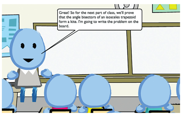 Ante lo presentado en la Figura 1, ¿qué se esperaría que el maestro escriba en el tablero? En la Figura 2 se muestran dos posibilidades; en la Figura 2a, el maestro dice “Copien el diagrama que está en el tablero y trabajen con sus vecinos en el problema;” el enunciado en el tablero dice “¿Por qué podríamos decir que los puntos de intersección de las bisectrices de un trapecio isósceles forman un romboide?” En la Figura 2b el maestro dice algo similar, “Copien el diagrama del tablero y trabajen con sus vecinos para enunciar los datos dados y hacer la prueba.” En el tablero está el enunciado que tienen que probar, el cual dice: “Demuestre que los puntos de intersección de las bisectrices de un trapecio isósceles forman un romboide.” ¿Cuál acción (2a o 2b) es más probable como continuación de lo mostrado en Figura 1? Y ¿por qué? ¿Qué otras opciones hay y cuáles son sus probabilidades? ¿Qué es lo que está involucrado en las respuestas a estas preguntas?