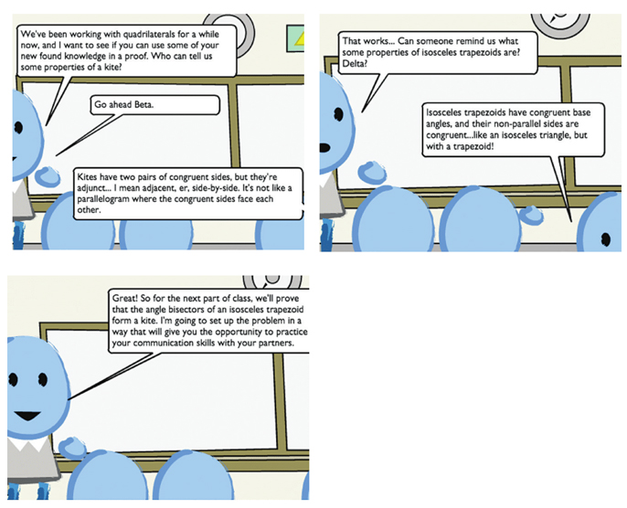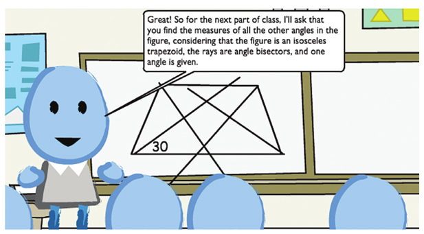 La segunda línea de razonamiento es que la racionalidad de la práctica incluye no sólo las consideraciones que subtienden lo real (lo que realmente ocurre en la práctica) sino también lo viable, lo concebible, y la diferencia entre aquéllos. Los problemas de decisión, en la medida en que ellos representan decisiones que el maestro debe de tomar, nos requieren considerar lo que será elegido, contra un trasfondo de posibilidades concebibles y tal vez también viables. La representación de esas alternativas requiere un lenguaje, pero la línea de razonamiento anterior sugiere que tal lenguaje puede beneficiarse de mantener componentes icónicas e indiciales en lugar de ser completamente transpuesto a un lenguaje simbólico. Esto nos deja dos posibilidades, el lenguaje de la actuación teatral y el lenguaje de los dibujos animados. Ambos son viables, y cada uno de ellos tienen ventajas sobre el otro. Nosotros hemos elegido trabajar con dibujos animados en lugar de actores pues los dibujos nos permiten no solamente la facilidad de crear escenas con un costo de producción muy bajo (usando la plataforma LessonSketch; Herbst, Aaron, & Chieu, 2013) sino también la posibilidad de pensar a la semiótica de la práctica constructivamente: en lugar de replicar todos los elementos visuales en la acción humana, cada una de las posibilidades gráficas de diferenciación (por ejemplo, las maneras de representar distintos colores de piel o expresiones faciales) no necesita darse por sentada sino que puede ser estudiada empíricamente en términos del papel que juegan en la representación de la enseñanza de las matemáticas.