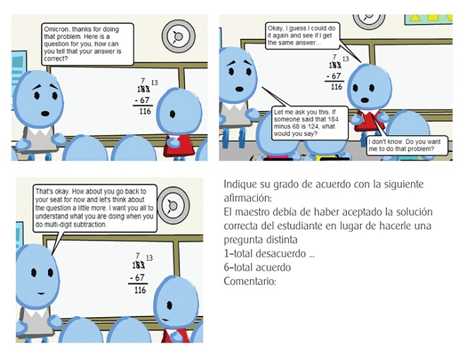 Por ejemplo, en la Figura 4 tenemos una de estas escenas presentada en el contexto de una clase de primaria. El maestro aquí ha transgredido una norma: si bien el estudiante resolvió el problema correctamente, el maestro no le ha dicho nada sobre la calidad del trabajo que hizo el alumno. Si lo que hizo el maestro fuera justificable, ¿cómo se justificaría? Nosotros les pedimos a nuestros participantes que digan en qué medida están de acuerdo con la afirmación que el maestro debería de haber aceptado la solución correcta del estudiante en lugar de darle una pregunta distinta.