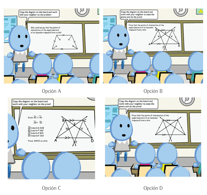 ¿Cuán probable es que un maestro de geometría se desvíe de la norma del registro diagramático cuando presenta un problema de demostración? En el caso del problema que planteamos antes, la Figura 5 muestra qué es lo que ha ocurrido en la clase inmediatamente antes de que el maestro presente el problema. Luego de mostrar esta escena les preguntamos a nuestros participantes qué harían ellos, y les damos lugar para una respuesta abierta. Luego les damos cuatro alternativas, que se muestran en la Figura 6.