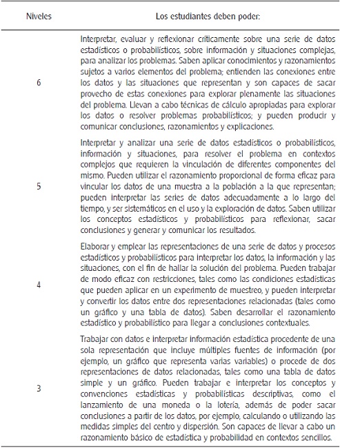 Los conceptos y actividades examinados incluyen la recolección, el análisis y organización de datos, además de su inferencia. En la Tabla 1 se describen las tareas y niveles de desempeño en esta sub-escala: