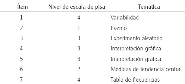 En la siguiente tabla se presenta la clasificación de los ítems que integraron la prueba, en términos de su nivel en la escala que establece PISA y la temática examinada.