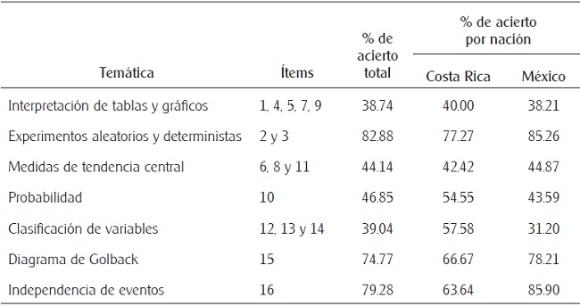 Para realizar el análisis, los ítems fueron separados por temáticas y se obtuvo el desempeño promedio total y por nación; además, se efectuaron pruebas de hipótesis de diferencia de proporciones de acierto, en las diversas temáticas, entre ambas naciones. Destaca sobremanera las dificultades de los profesores para interpretar tablas y gráficas, en los que solo 38.74% del total de participantes acertaron en promedio para los cinco ítems correspondientes a dicha temática.
