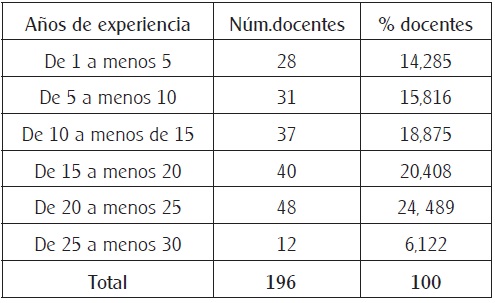 7. En el cuadro siguiente se muestran los años de experiencia que tienen 196 docentes de educación primaria que fueron encuestados en el 2009