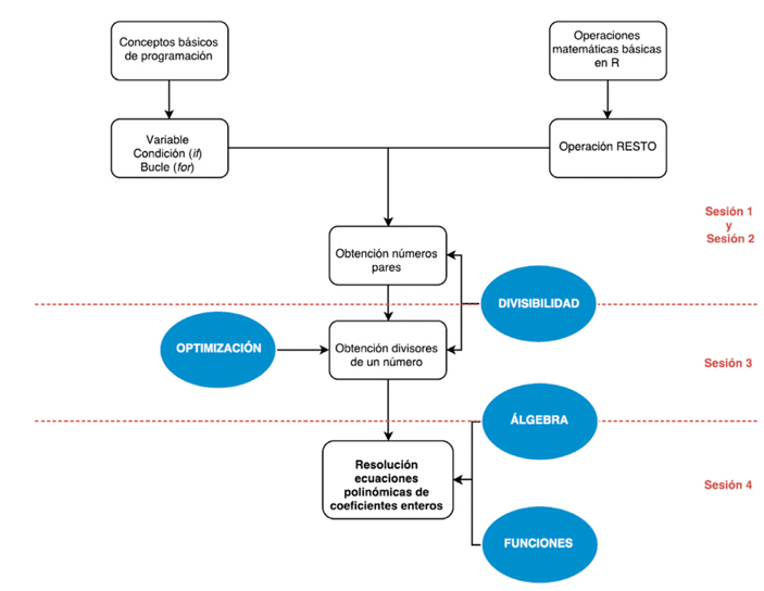 En la Figura 1 se muestra un esquema que representa el orden en que se plantearon los diferentes contenidos y problemas a lo largo de las cuatro sesiones.