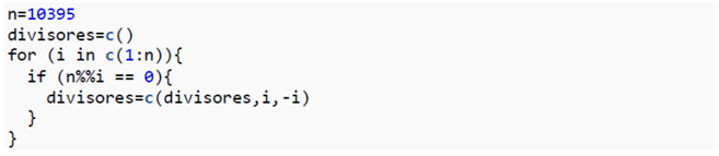 Tras unos minutos, la mayoría de los alumnos consiguió darse cuenta de que la modificación requerida respecto del bucle anterior era ligeramente superior, siendo imprescindible invertir los papeles de i y n para plantear la condición n %% i == 0, como puede verse en la Figura 6.