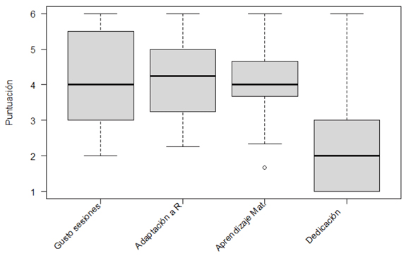 La puntuación media de dedicación a las sesiones muestra que el compromiso de trabajo que adquirieron los estudiantes fue más bien bajo. Ante la falta de evaluaciones anunciadas sobre el contenido de las sesiones, los alumnos, salvo algunas excepciones, acudieron a cada nueva sesión sin repasar convenientemente lo visto en las anteriores y, evidentemente, esto debió traer como consecuencia mayor dificultad para asumir los nuevos problemas que se les iban planteando, lo que en parte se reflejó en la variable adaptación al lenguaje R.