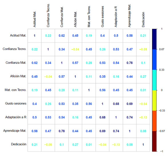 En esta gráfica no se distingue ninguna relación fuertemente negativa entre las variables, es decir, no existe ninguna cuyo mayor valor influya negativamente en otra. Al contrario, lo que se observan son varias relaciones claramente positivas entre algunas de ellas, como las fuertes correlaciones existentes entre los bloques gusto por las sesiones, adaptación al lenguaje R y aprendizaje de matemáticas durante las sesiones. La presencia clara de esta relación entre las tres variables parece revelar que los alumnos que disfrutaron de las sesiones comprendieron adecuadamente el lenguaje y absorbieron los contenidos matemáticos, fueron en buena medida los mismos para las tres facetas. Esto es en parte positivo, ya que es un indicador de que algunos fueron capaces de aprovechar las sesiones de la manera más completa posible. Pero, a su vez, indica que otros que tuvieron dificultades para adquirir el lenguaje fueron poco capaces de disfrutar o de adquirir/reforzar los conocimientos matemáticos que se trataron. Por último, debe destacarse la mayor correlación que puede observarse entre las variables confianza con las matemáticas y aprendizaje de matemáticas durante las sesiones. Independientemente de los gustos hacia las matemáticas o la tecnología, los estudiantes con mejor opinión sobre sí mismos en cuanto a dominio matemático fueron también quienes consideraron que aprendieron más matemáticas durante las sesiones, probablemente debido a que su verdadero mayor nivel matemático permitió el correcto aprovechamiento de las clases en ese aspecto, sin importar tanto su mayor o menor desempeño e interés por el lenguaje de programación R.