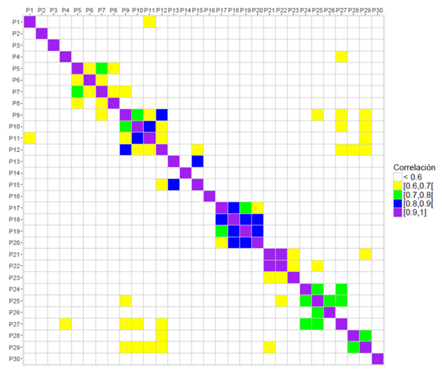 La Figura 14 muestra las correlaciones de mayor relevancia producidas dentro del conjunto de las 30 preguntas. En esta gráfica se distinguen algunas agrupaciones de preguntas consecutivas muy correlacionadas, por corresponderse con los propios bloques previamente definidos como los de confianza con la tecnología (P5-P8), confianza con las matemáticas (P9-P12) y uso de la tecnología para aprender matemáticas (P17-P20). La fuerte relación entre preguntas de un mismo bloque es esperable, pero no todos los bloques o categorías muestran el mismo comportamiento. De hecho, dentro del de confianza con la tecnología (P5-P8), altamente correlacionado internamente, las preguntas P6 y P8 tienen poco que ver entre sí, lo cual indica que el buen uso de los dispositivos digitales no siempre implica un buen manejo de los programas informáticos que se utilizan en las aulas, y viceversa.